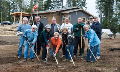 Gabriola Lions hard at work raking the grounds in preparation for landscaping at the Community Health Centre site. The new helicopter pad wind sock and the building are in the background.