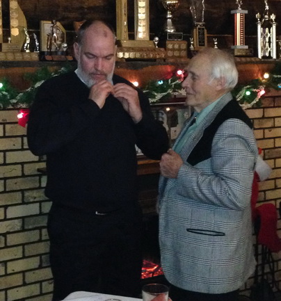 New Lion Jon Carlson attaches his Lions pin as his sponsor, Lion Eric Boulton, looks on during Jon's induction ceremony on Dec 9. (Photo: BK)